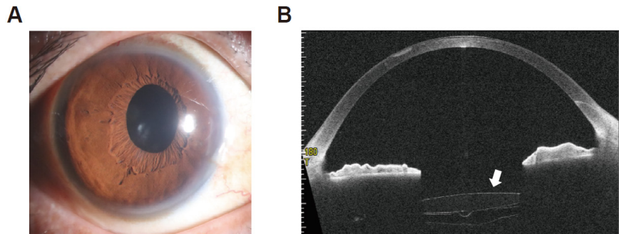 (A). The photograph of anterior segment shows the cornea is transparent and the IOL is well-centered in the right eye; (B). AS-OCT CASIA2 examination show the IOL position is centered. The tilt of the IOL is 4.6 degree and the decentration is 0.16 mm.