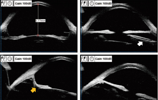 The results of UBM examination show that the anterior chamber is open in both eyes. The ACD of the right eye is 5.77 mm, the iris is inverted (yellow arrow), and the lens zonule is sparse and elongated around the eyes. IOL dislocates downward in left eye, and the IOL echo can be seen at 5-8 o 'clock behind the iris (white arrow).