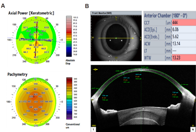 The results of CASIA2 examination show that the central cornea thickness of the right eye is 444 μ m, the cornea diameter is 13.23 mm, and the ACD is 5.62 mm.