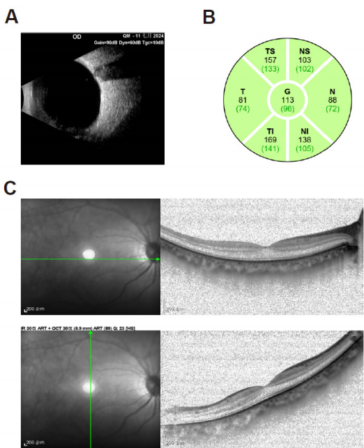 (A). B ultrasound shows slight opacity in the vitreous; (B). Fundus OCT shows the nerve fiber layer thickness is normal; (C). Fundus OCT shows the macular structure is normal in the right eye.