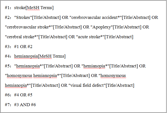 系统检索中国知网、维普数据库、万方数据库、中国生物医学文献数据库、PubMed、Web of Science、Embase、CINAHL、Cochrane Library共9个数据库。采用主题词与自由词结合的方式进行检索。中文检索词包括:“卒中/中风/脑梗死/脑出血/脑缺血/脑血栓/脑栓塞/脑血管意外/脑血管中风”;“偏盲/同侧偏盲/同向偏盲/VFD/视野障碍”;英文检索词包括:"Stroke*/cerebrovascular accident*/cerebrovascular stroke*/Apoplexy/cerebral stroke*/acute stroke*";"hemianopsia*/hemianopia*/homonymous hemianopsia*/homonymous hemianopia*/visual field defect"。以PubMed为例,检索策略见图1。检索时限为建库至2024年4月10日。为尽可能不遗漏,同时追溯纳入文献的相关参考文献。