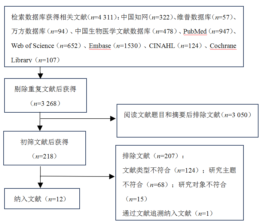 检索数据库获得相关文献4 311篇,剔除重复文献后获得3 268篇。首先对文献进行初步筛选,剔除与研究主题不相关的文献,排除3 050篇;再对剩余的218篇文献阅读全文复筛,排除文献类型、研究主题、研究对象不符合的文献207篇;后通过文献追溯获得1篇,最终纳入12篇。筛选详细流程见图2。