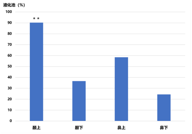 在所有检出液化池的41只眼中,15眼在1个象限检出液化池,14眼在2个象限检出液化池,6眼在3个象限检出液化池,6眼在4个象限检出液化池。总体而言,未成年阶段液化池最常累及1~2个象限(29眼,70.7%,P<0.001)。值得注意的是,液化池的空间分布频率依次为颞上(90.2%)、鼻上(58.5%)、颞下(36.6%)、鼻下(24.4%),颞上象限最常见 (P <0.001),见图3。此外,在所有仅检出1个象限液化池的15只眼睛中,13眼(86.7%)位于颞上象限,2眼(13.3%)位于颞下象限,也是颞上象限最常见(P <0.001)。