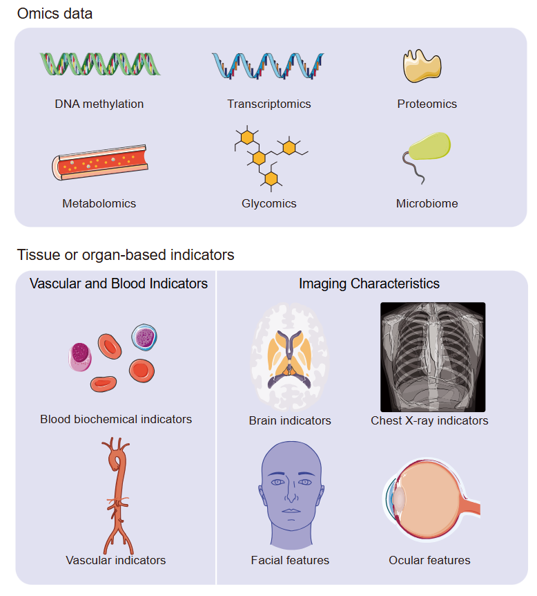 Biological age (BA), a measure derived from the physiological condition of an individual’s systems and organs, represents a comprehensive assessment of aging. It surpasses chronological age in its predictive ability for age-related diseases and mortality risks. Compared to chronological age, which simply counts the passage of time since birth, BA integrates complex factors such as genetic predisposition, environmental influences, and lifestyle choices that collectively influence the aging trajectory.[1] It has been widely hypothesized that the estimated age using these complex factors can effectively measure an individual’s biological age. The difference between estimated age and chronological age is referred to as the “age gap”. Individuals with positive age gaps face accelerated aging and are at higher risk of mortality and are more susceptible to age-related diseases. Numerous studies have demonstrated that BA serves as a robust predictor of diseases such as cardiovascular ailments and diabetes, highlighting its potential to reflect the cumulative impacts of these diverse factors on an individual’s health span.[2-3] Therefore, BA can be utilized as a quantitative indicator to accurately assess individuals’ levels of functional status, facilitating implement of early health interventions and reduction of the disease burden.BA is a complex process driven by the interactions of countless molecules and various biological mechanisms. Identifying molecular biomarkers and other factors that reflect biological age not only enhances our understanding of aging’s underlying mechanisms but also provides drug targets for addressing age-related diseases. Furthermore, integrating multiple factors and developing explainable prediction models of biological age offer personalized insights into an individual’s aging process, guiding tailored interventions and treatments, such as medication and lifestyle changes. As the global population ages, the prevalence of age-related diseases and mortality rates have risen significantly. This personalized healthcare approach promotes early detection and intervention, leading to more precise treatments and a reduction in the overall disease burden.