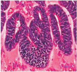 源自视神经的髓上皮瘤的病理特征为[7]:肿瘤没有包膜,有许多由立方和柱状上皮细胞构成的管状和乳头状结构,类似于原始的髓板和神经管;有未分化的间充质细胞,呈侵袭性生长,常见出血和坏死。源自视神经的髓上皮瘤同样可分为畸胎性和非畸胎性髓上皮瘤[8]。非畸胎性髓上皮瘤只含有髓上皮成分和间质成分,含有一种或多种异源性成分的髓上皮瘤则称为畸胎性髓上皮瘤[9],最常见的异源性成分是软骨,较少见的异源性成分是脑样组织和骨骼肌组织[7]。本例患者,肿瘤有许多类似于原始髓板和神经管的成分,并且有许多透明软骨样组织,且肿瘤发生于眼球后,所以考虑该肿瘤为源自视神经的畸胎性恶性髓上皮瘤。