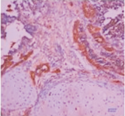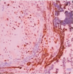 图 3 NSE染色围成管腔样结构的细胞阳性 HE×100 图 4 S-100染色软骨样细胞阳性 HE×10