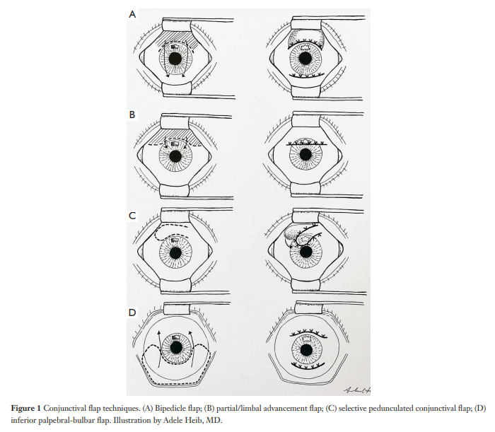 Conjunctival flaps and its modifications still have a place today among the more modern surgical procedures used to preserve the eye and restore vision. This procedure may be underutilized, despite the development of corneal transplantation techniques, amniotic membrane grafts, bandage contact lenses, limbal stem cell transplants, tissue adhesives, nerve growth factor, and anti-inflammatory modulators, among others. Conjunctival flaps may be especially useful in areas where transplantable tissue is unavailable at the time of perforation and when ulcerations are too large for the reasonable application of adhesives.
