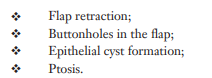 Incomplete removal of corneal epithelium may result in epithelial inclusion cysts, which are often occur at the limbus. Small epithelial inclusion cysts have been reported to occur at a rate of 2.5% (11). The cysts may be easily drained with a needle but often recur; excision of the cyst wall can prevent such recurrence (9,11).Fluid accumulation under flap