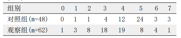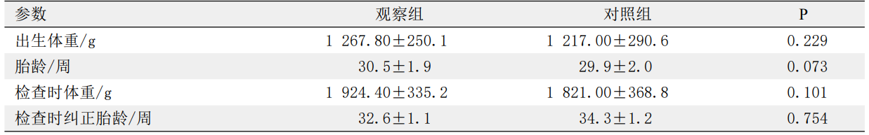 (gestational age, GA) ≤32周的早产儿110例,其中男58例,女52例,排除正在使用有创呼吸支持需要镇静及禁食的患儿,由电脑随机分配到观察组和对照组中,其中观察组62例,对照组48例,两组之间在胎龄、性别、出生体重、检查时纠正胎龄、体重等方面差异无统计学意义。见表1。