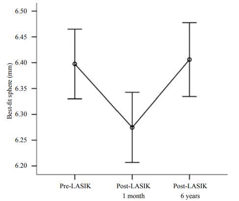 Results: There was no statistical difference between the mean best-fit sphere (BFS) pre-LASIK and 6 years