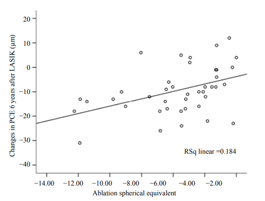 There are several limitations in this study. Although this cohort of patient was retrospectively identified and invited back for an updated examination, there was a high loss to follow-up rate (80%) and we ended up with a relatively small number of patients (only 42 eyes). On the other hand, additional data from the period between 1 month post LASIK to 6 years postop would be highly desirable, thus we would not be able to identify if there were any changes in between and the time when these changes in the posterior elevation may have taken place or stabilized. The adjusted R2 value of the final regression model for the changes in PCE was 0.184, indicating a significant degree of variation in the dependent variables of the changes in PCE 6 years post LASIK. Furthermore, the changes in PCE are only one of the outcomes used for assessing keratectasia after LASIK. Another useful parameter would be corneal topography. Other parameters, such as the ablation depth and RBT may also be considered when evaluating keratectasia after LASIK. Therefore, the changes in PCE after LASIK must be interpreted in the light of above variables.