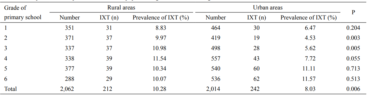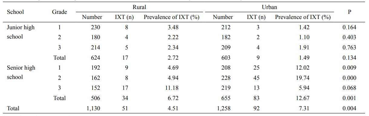 In this survey, the correlation between confounding factors and the prevalence of IXT was investigated. The results showed that, for pupils, the prevalence of IXT was correlated with sex, grade and place of origins rather than age. In addition, male pupils at high grades in rural areas had a relatively high prevalence of IXT. For secondary school students, the prevalence of IXT was not correlated with age, but associated with sex, grade and place of origins. Male secondary students at high grades in urban areas had a relatively higher prevalence of IXT than the other subjects. Logistic regression analysis revealed that IXT had a greater prevalence in males than females. Correlation analysis of grade and place of origins showed that the students at senior high schools in urban areas and the pupils in rural regions had a high prevalence of IXT.