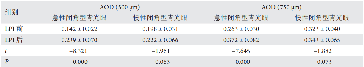 前、术后2周前房角开放距离差异无统计学意义(P>0.05)。结论:急性闭角型青光眼LPI术后前房角开放距离增加,治疗效果较好;慢性闭角型青光眼LPI术后前房角开放距离增加不明显,术后仍存在前房角闭塞趋向。