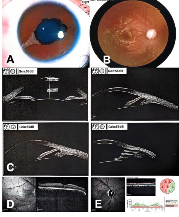 (A) Anterior segment photography of the right eye after surgery shows a deep anterior chamber and the tube of the glaucoma drainage device placed in the anterior chamber at the 8 o'clock position; (B) Fundus photography shows: glaucomatous optic disc cupping in the right eye; (C) Postoperative UBM of the right eye shows the Ahmed glaucoma valve tube located in the anterior chamber at the 8 o'clock position; (D, E) OCT of the right eye indicates normal macular morphology and structure, with significant thinning of the peripapillary retinal nerve fiber layer in all quadrants except for the nasal and inferonasal regions.
