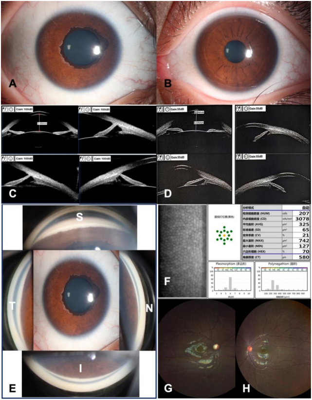 (A) The cornea of the right eye is clear, with a pupil measuring 5 mm. Nearly 360° of uveal ectropion covers the anterior surface of the iris, with clear boundaries; (B) Anterior segment photography of the left eye shows no obvious abnormalities in the iris and pupil; (C, D) Ultrasound biomicroscopy: The central anterior chamber depth of the right eye is 3.48 mm, with anterior iris insertion and angle-closure (the upper right, lower left, and lower right images show the angle structures at the 3, 6, and 9 o‘clock positions, respectively). The central anterior chamber depth of the left eye is 3.54 mm, with open angles (the upper right, lower left, and lower right images show the angle structures at the 3, 6, and 9 o‘clock positions, respectively); (E) The left, upper, right, and lower images represent the temporal, superior, nasal, and inferior gonioscopic views, respectively. Gonioscopic photography shows that the iris root is attached anteriorly, with goniodysgenesis. The central image is the anterior segment photograph; (F) The corneal endothelial cell density, morphology, and hexagonal cell ratio of the right eye are normal. (G, H) Fundus photography reveals: glaucomatous optic disc cupping in the right eye, while no significant abnormalities are observed in the left eye.