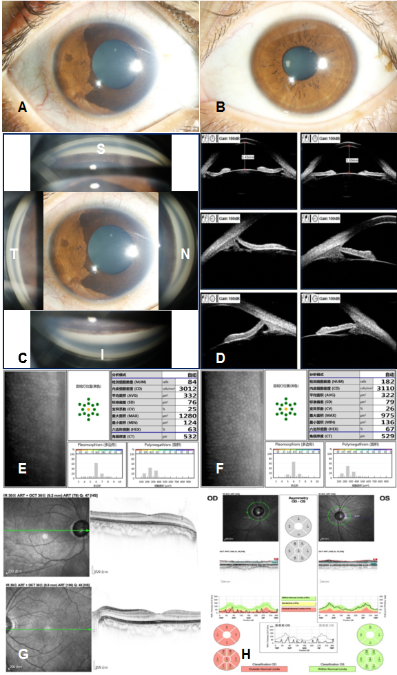 (A) 右眼结膜轻度充血,角膜透明,瞳孔约5.5 mm大小,向鼻侧移位,近360°葡萄膜外翻呈棕褐色覆盖于正常虹膜表面;(B) 左眼眼前段照相,虹膜瞳孔均未见明显异常;(C) 右眼房角镜照相:左、上、右、下图分别为颞侧、上方、鼻侧、下方房角镜图像,中央为眼前段照相,可见全周房角宽角开放,未见明显粘连,上方房角和下方房角的小梁网可见棕褐色色素颗粒沉着;(D) 超声生物显微镜检查: 右眼中央前房深度3.43 mm,周边虹膜后凹(左上图),7点位虹膜根部附着点靠前、房角关闭(左下图),其余全周房角开放(左中图所示为9点位房角)。左眼中央前房深度3.50 mm(右上图),虹膜未见明显异常,9点、3点位房角结构未见明显异常(分别为右中图和右下图);(E,F) 右眼(E)角膜内皮细胞密度、形态、六边形比例与左眼(F)对比未见明显异常;(G) 双眼的黄斑区形态结构均基本正常。(H) 右眼视盘周围神经纤维层厚度各个方位均显著变薄,左眼视盘周围神经纤维层厚度正常。