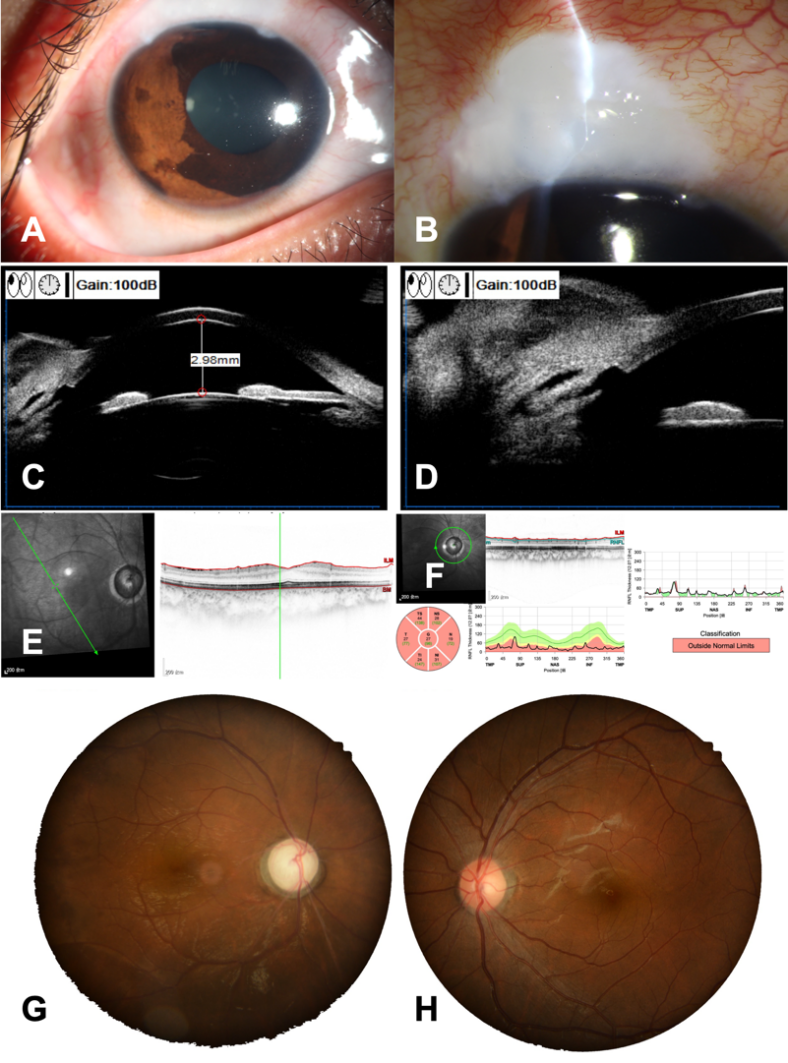 (A, B) Anterior segment photography of the right eye after trabeculectomy shows a deep anterior chamber and a filtering bleb; (C, D) Postoperative UBM of the right eye shows a patent peripheral iridectomy, with a central anterior chamber depth of 2.98 mm; (E, F) OCT of the right eye indicates normal macular morphology and structure, with significant thinning of the peripapillary retinal nerve fiber layer in all quadrants; (G, H) Fundus photography shows: glaucomatous optic disc cupping in the right eye, with no significant abnormalities observed in the left eye.