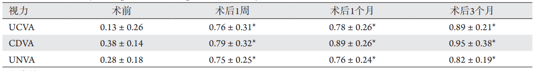 术后随访3个月,记录术后1周、1个月、3个月的裸眼远视力(uncorrected distance visual acuity,UCVA),最佳矫正远视力(best corrected distance