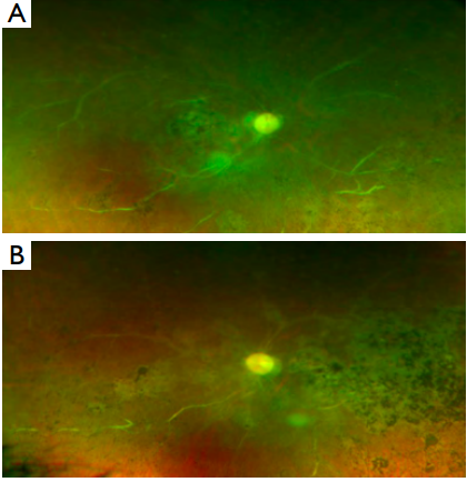 Figure 2 Ultra-wide fundus photograph OU depicting mixed vascular sclerosis, macular atrophy and optic atrophy. Pigmentary changes can also be seen throughout the fundus.