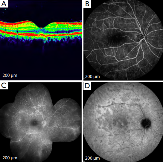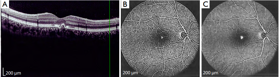 examination, fluorescein angiography, and optical coherence tomography (OCT) were compatible with a