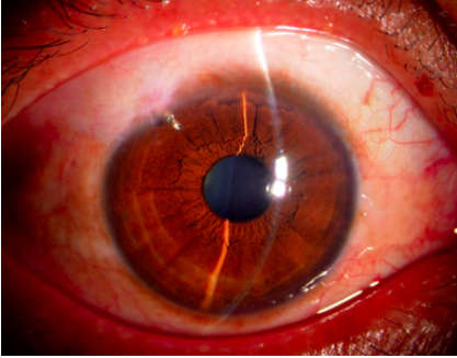 图1引流钉位于前房(颞上方),相应部位结膜弥散隆