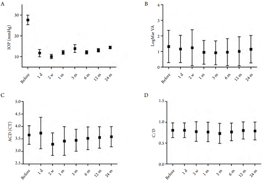 值;(C)术后各时间点患者前房深度(CT)保持稳定;(D)术后C/D值无明显改变(A) Compared with preoperation, the mean IOP significantly reduced in each time point after operation; (B) the best corrected visual acuity