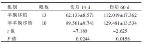表 1 羊膜移植组和非羊膜移植组角膜新生血管面积的比较(mm²,X̄ ± s)