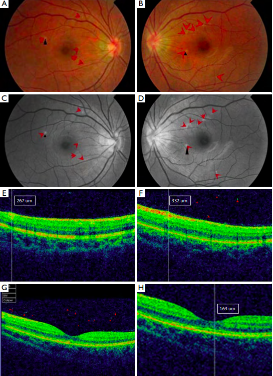 A 30-year-old woman, Han People, diagnosed with dengue fever by dengue polymerase chain reaction (PCR) test, presented with retrobulbar pain in both eyes two days after the onset of fever. Seven days after onset of fever, she had central scotoma, floaters and blurring of vision in the left eye which coincided with thrombocytopenia and leukopenia. She had experienced high myopia in both eyes since she was a teenager. Her best corrected visual acuity (BCVA) of both eyes was above 1.0. All symptoms and test results were normal in the right eye. Left eye BCVA was 0.3 and its introcular pressure was normal. No other abnormal findings were found in the anterior segment. Retinal examination revealed blurring of the optic disc margin and several white spots in the posterior retina which were only around the retinal capillaries (Figure 1A,B,C,D). Optical coherence tomography (OCT) imagery revealed that the white spots were only located in the retinal outer layers (Figure 1E,F), and also macular cystic foveolitis and breakage of the inner segment/ outer segment junction (IS/OS junction) (Figure 1E,G). Vitreous cells were also observed (Figure 1F,G). Central scotomata and floaters gradually decreased while platelets and leukocyte levels improved. Visual and retinal recovery were completely gained 20 days after the onset of disease without any treatment. However, the OCT imagery still showed a slight disruption of the IS/OS junction in the same place (Figure 1H).Case 2
