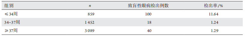 表 2 接受眼底检查婴儿不同出生胎龄致盲性眼病检出率