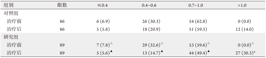 Table 1 Comparison of visual acuity before and after treatment in 2 groups [No. (%)]