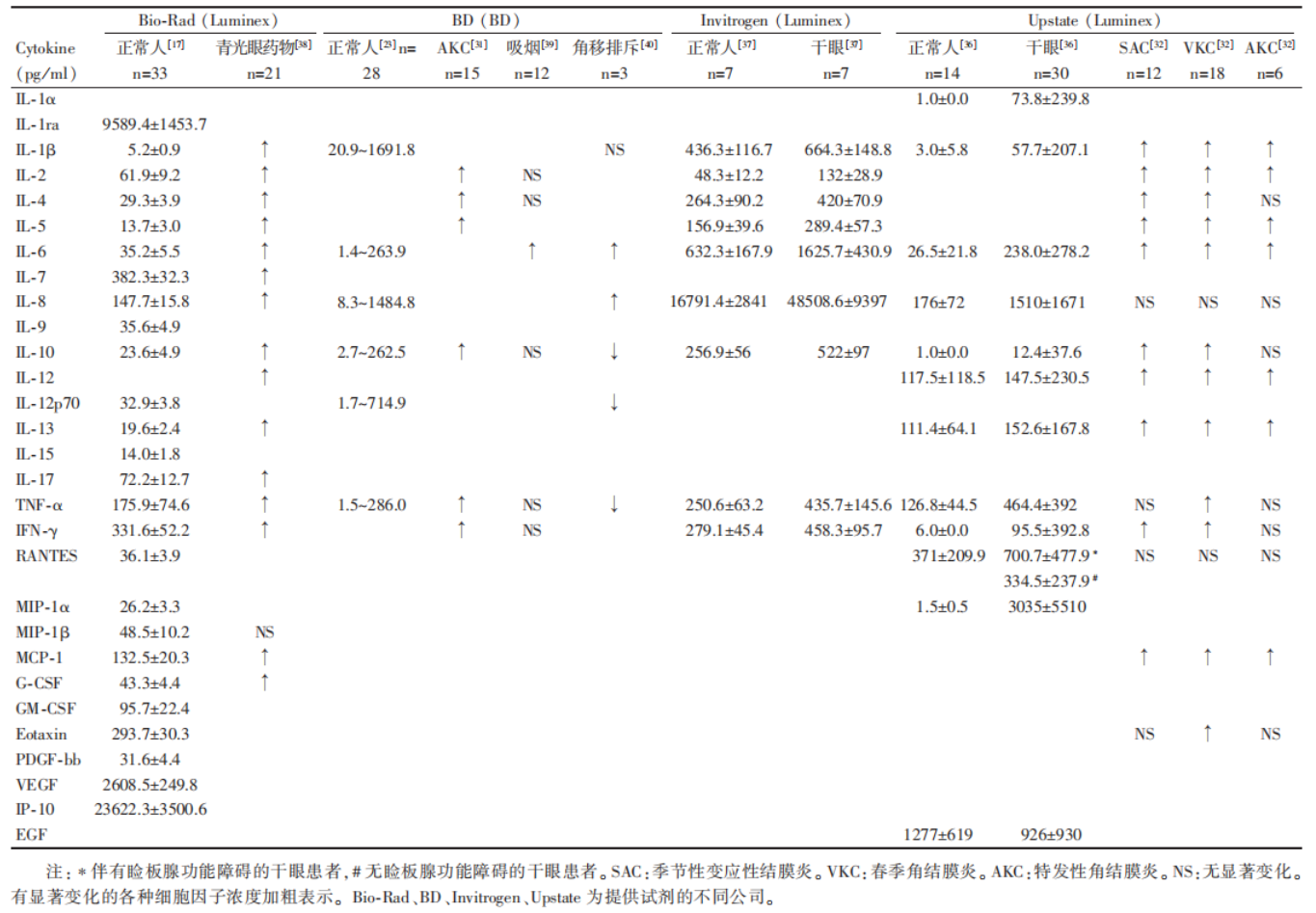 虽然理论上各实验室可以自行构建芯片,但目前应用液相芯片技术分析泪液的研究大多采用商品化的液相芯片试剂盒,而商品化的液相芯片主要是针对细胞因子的产品,其在泪液的检测仍局限于常见的各种细胞因子。下面就已报道的分析结果进行总结。