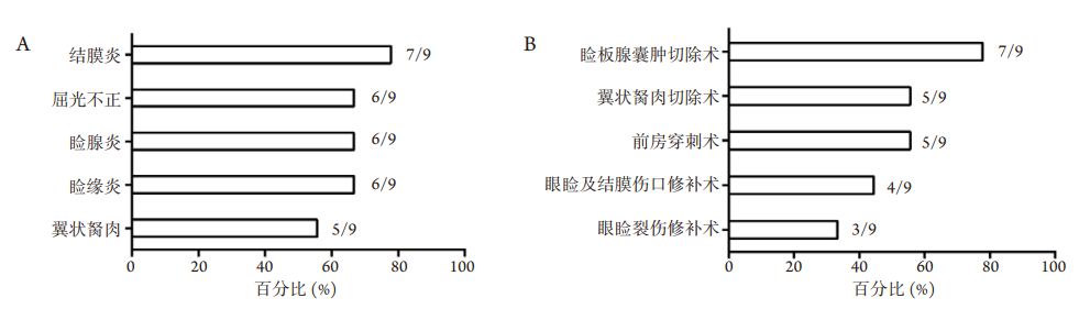 拆线、眼部包扎和上睑下垂检查操作;77.8%(7/9)的医师可以独立完成Schiotz眼压测量、斜视复视检查以及拔倒睫操作。另外,我们还对委托培养住院医师的临床操作水平进行主观调查评价,他们认为能独立治疗疾病情况以及能独立完成手术种类情况如图2,5/9以上的学员认为可以独立治疗结膜炎、屈光不正、睑腺炎、睑缘炎和翼状胬肉等常见眼病;有7名学员可以单独完成睑板腺囊肿切除术,5名学员可以完成翼状胬肉切除及前房穿刺术,更有3~4名学员可以独立完成眼睑及结膜伤口修补术和眼睑裂伤修补术。