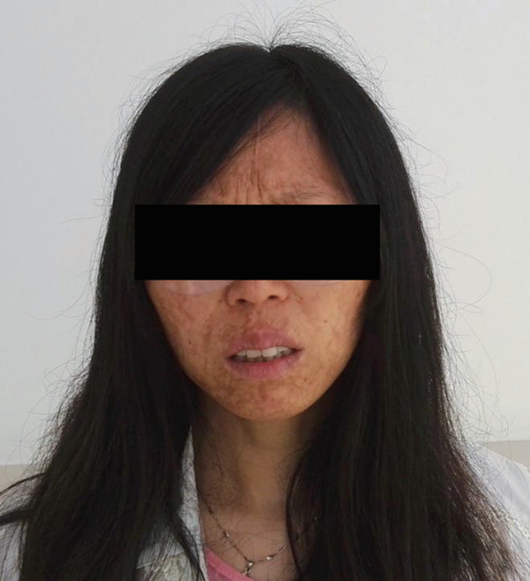 图1 患者面部及颈部皮肤遗留色素瘢痕