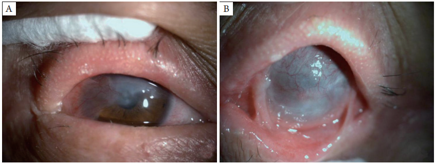 眼压:右眼12 mmHg(1 mmHg=0.133 kPa),左眼6 mmHg。右眼上睑轻度内翻、红肿,眼睑皮肤粗糙,睑缘变钝,结膜囊较多分泌物,结膜混合性充血(+),颞上1/2角膜片状白色混浊,新生血管由外眦部长入(图2A),前房深度正常,房水清,瞳孔圆,直径约3 mm,对光反应存在,眼内结构窥不清;左眼上睑内翻倒睫,眼睑皮肤粗糙,睑缘变钝,内外眦处上下睑结膜粘连,结膜混合性充血(++),角膜混浊,大量新生血管翳长入(图2B),前房及眼内结构无法窥见。双眼角膜荧光染色阳性(图3A,3B),实验室检查:WBC