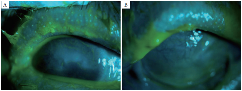 (A) Right corneal ffuorescein staining (+); (B) Leff corneal ffuorescein staining (+).