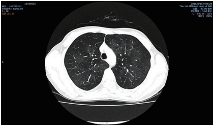 图4 双肺见多个条片状淡薄高密模糊影及散在磨玻璃影