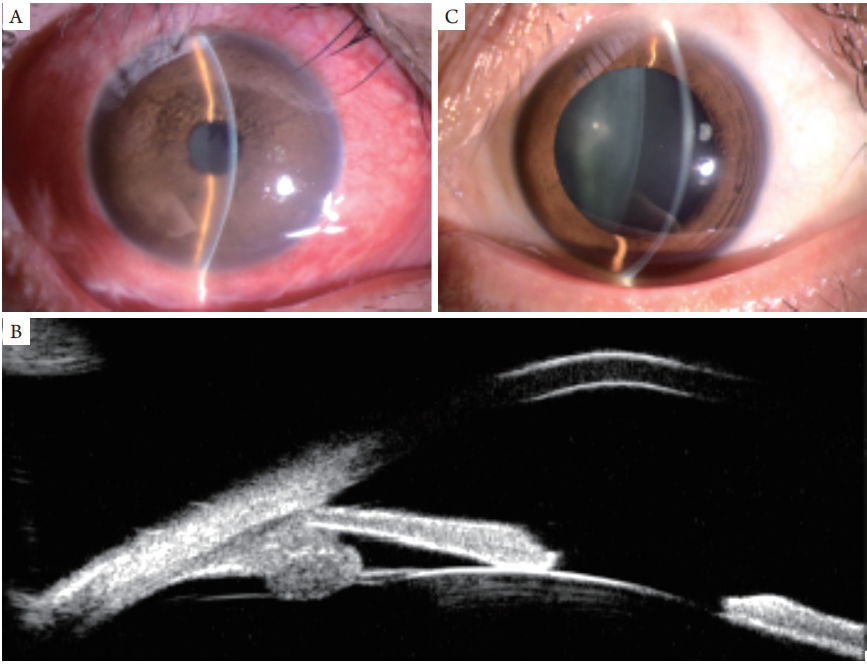 (A)右眼中度结膜充血,角膜轻水肿,KP(–),前房略浅,房角窄,瞳孔收缩、虹膜后粘连,晶体轻混;(B)右眼UBM显示房角关闭,虹膜未见明显异常;(C)左眼晶体轻混,余前节未见明显异常。