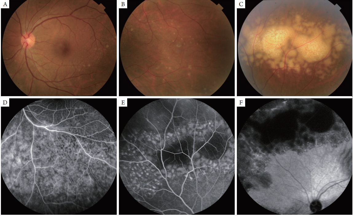 PVRL作为PCNSL的亚型,好发于60岁左右的人群[13,26]。其常伪装成后葡萄膜炎,对抗炎治疗反应差[13,27]。多数PVRL表现为玻璃体混浊、视网膜或网膜下渗出。PVRL的特征性表现为玻璃体混浊、大量片状和/或团状玻璃体细胞[27]。尽管患者有中至重度的玻璃体混浊,但视力往往比预期要好。PVRL最具特征性的表现为黄白色或黄橘色的网膜下渗出,随时间推移,可增大、融合(图2A-2C) [27]。还可伴随其他异常,如出血、视网膜血管炎、视神经浸润