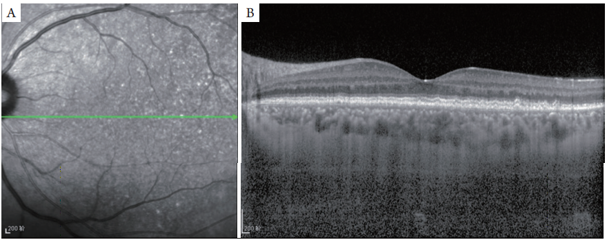 (A)后极部可见多个高荧光点;(B)黄斑区OCT可见光感受器IS/OS层连续性中断,RPE-Bruch膜复合体信号轻度增强。