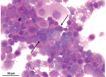 图4 PVRL患者玻璃体标本的细胞学检查。可见非典型性大淋巴样细胞(箭头所示),细胞核大、核仁明显、嗜碱性胞浆减少。同时可见坏死细胞(星号所示)与淋巴细胞