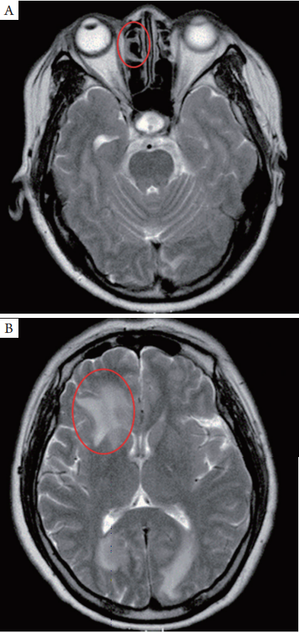 (A)轴位T2加权像(T2W)低平面扫描可见右侧筛窦扩大、变形、壁增厚(红圈所示);(B)T2W可见右侧胼胝体局灶性高密度影(红圈所示)。