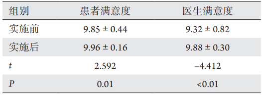 采用SPSS20.0软件进行统计分析,医生和患者对护理工作的满意度采用均数、标准差进行描述,采用t检验比较实施前后满意度是否有统计学差异。检验水准α=0.05。P<0.05为差异有统计学意义。