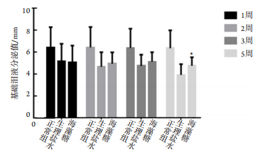 各时间点基础泪液分泌结果见图 1。试验结果显示:造模术后各时间点实验组和对照组的泪液分泌量较正常组 [(6.4±1.3) mm] 明显减少,差异均有统计学意义(P < 0.05)。用药 28 d,即术后第 5 周后,海藻糖实验组 [(4.8±0.8) mm] 较生理盐水对照组 [(3.9±0.9) mm] 泪液分泌量增加,两组相比差异有统计学意义(P < 0.05),其余时间点差异均无统计学意义(P > 0.05)。
