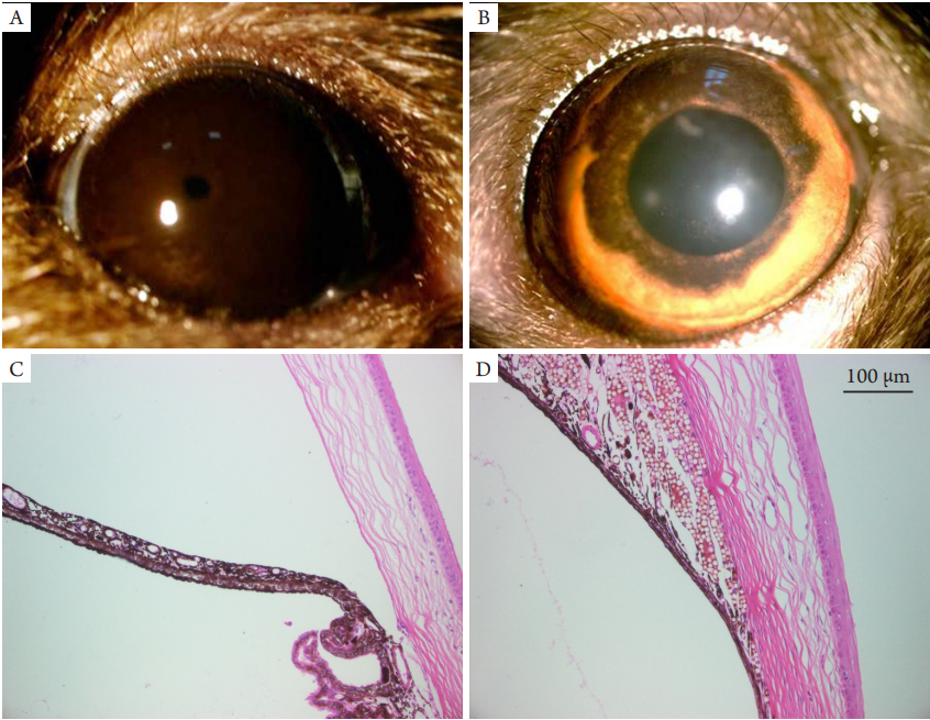 (A)造模前和(B)造模后行眼前段照相情况(×16);(C)造模前和(D)造模后房角HE染色情况(×200)。