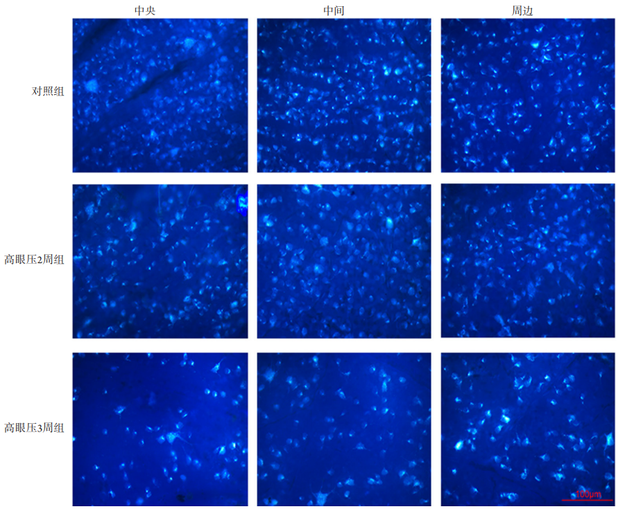 BN(Brown Norway)大鼠(6~8周雄性)由北京维通利华公司提供,均排除眼部及全身疾病。随机分为5组,每组10只,共50只,分别为对照组、高眼压3 d组、高眼压7 d组、高眼压2周组和高眼压3周组。所有动物均对右眼进行操作,左眼不做处理。动物饲养于中山大学中山眼科中心SPF级动物实验室,本研究所采用的各种动物实验操作均经动物管理委员会批准。