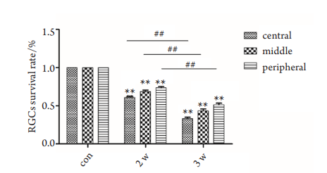 高眼压2周组与对照组相比,不管是中央、中间,还是周边视网膜,均出现明显的RGCs凋亡,RGCs的存活率分别为61.1%±1.1%,68.5%±8.5%,73.6%±3.6%,差异具有显著统计学意义(P<0.01)。高眼压3周时,RGCs的存活率明显下降,分别为33.2%±3.2%,43.4%±3.4%,51.4%±1.4%,与对照组相比,差异同样具有统计学意义(P<0.01)。对比2周及3周组,可以观察到RGCs的存活率的显著性下降,差异有统计学意义(P<0.01,图3,4)。