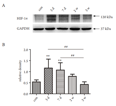 对照组可检测到极微量的HIF-1α;高眼压3天组与对照组相比,HIF-1α蛋白的表达差异具有统计学意义(P<0.01),说明视网膜组织在眼压处于较高水平时,开始出现大量HIF-1α积聚;高眼