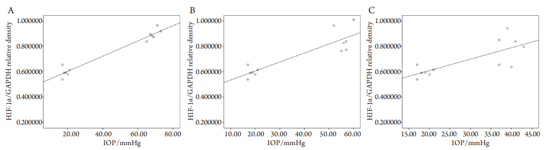 表示对照组与高眼压3天组(A)、高眼压7天组(B)、高眼压2周组(C)的HIF-1α的蛋白表达与眼压值成正相关关系。