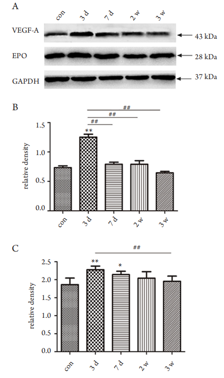 在对照组,均可检测到VEGF-A和EPO;高眼压3天组与对照组相比,二者的表达差异具有统计学意义(P<0.01),均出现表达的高峰;随着高眼压的时间延长,二者开始逐渐降低,高眼压7天组的VEGF-A与对照组相比,差异无统计学意义(P>0.05),而EPO的表达差异仍具有统计学意义(P<0.05),说明EPO在高眼压作用下维持时间较VEGF-A长。高眼压2周组与高眼压3周组和对照组