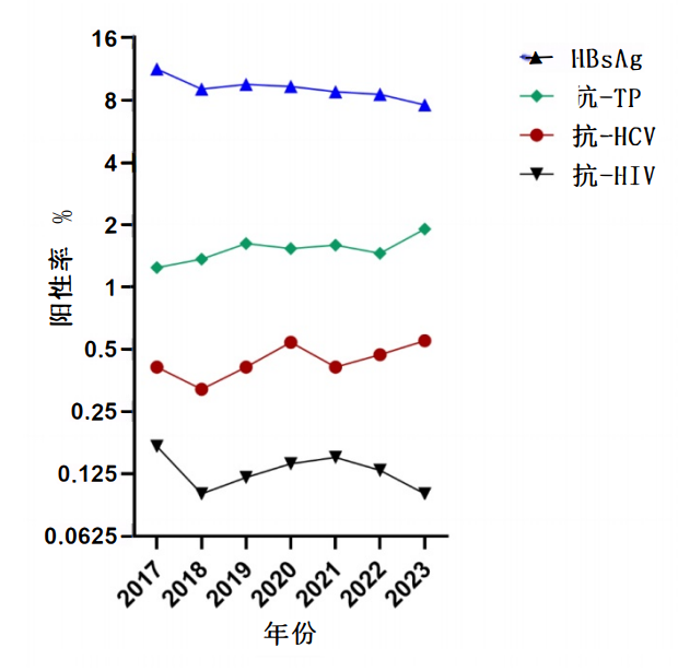 2017-2023年眼科患者四项感染指标阳性率的时间变化如图2所示。患者HBsAg阳性率呈逐年下降,从2017年的 11.60 %递减至2023年的7.52 %;患者抗-TP阳性率呈总体上升,从2017年的1.24%增长至2023年的1.90%;患者抗-HCV阳性率总体上升但变化不大,从2017年的0.41%增长至2023年的0.55%;患者抗-HIV阳性率总体下降但幅度不明显,从2017年的0.17%下降至2023年的0.10%。